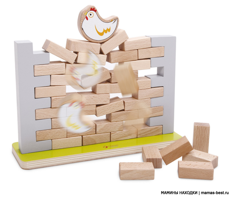Как играть: на стене, состоящей из деревянных кирпичиков сидит курочка, необходимо по очереди вытаскивать брусочки и как можно дольше удержать курочку наверху. Проигрывает тот, кто разрушил стенку и уронил курочку.