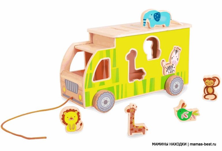 Настоящий мобильный зоопарк-грузовик в руках вашего ребёнка и занимательный сортер. Деревянная каталка на веревочке и красочный сортер с фигурками экзотических животных с выдвигающейся дверкой.
