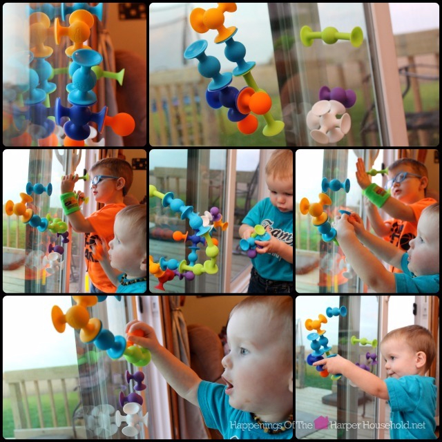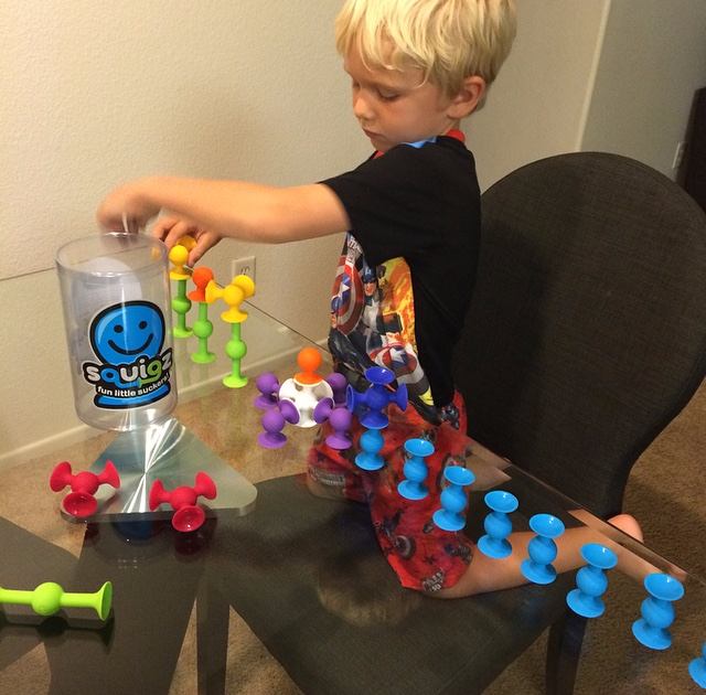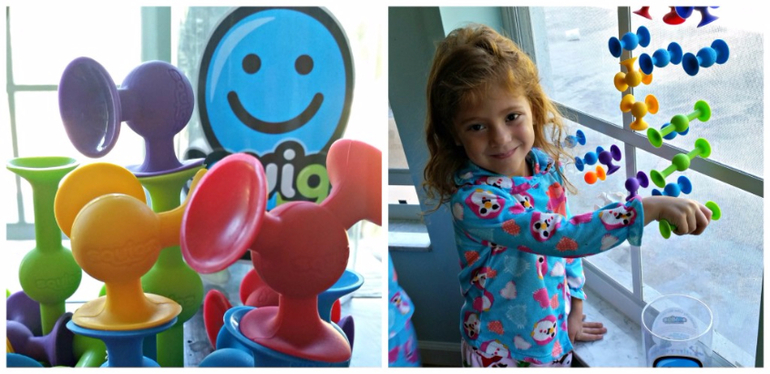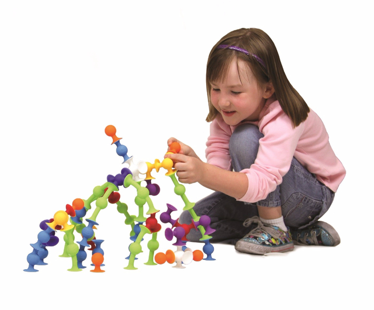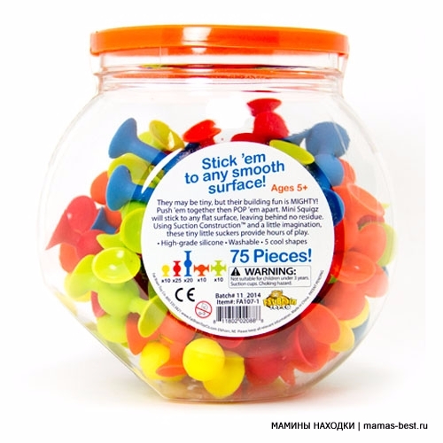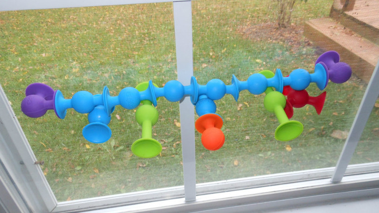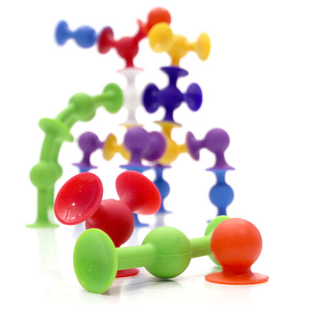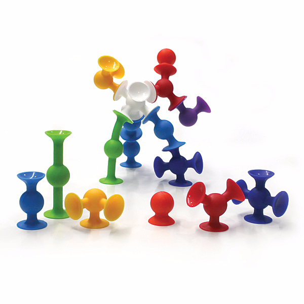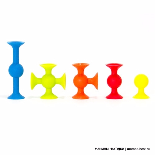 Присоски прилипают к любым гладким поверхностям, детали стартового набора совместимы со всеми видами конструкторов-присосок Squigz.