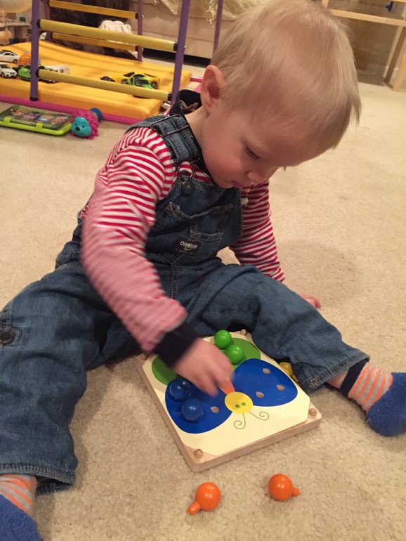 Мозаика от Plan toys, до которой мы доросли. Замечательно тренирует моторику, координацию и работу по шаблону. На фото только крупные элементы, до мелких мы ещё не очень доросли, так как в рот тянем. А с крупными элементами можно спокойно играть с 2 лет. Если ребёнок в рот не тянет ничего, то и с мелкими элементами тоже. У мозаики один существенный минус: хотелось бы побольше шаблонов. А так маме придётся найти шаблоны от Лавочки, вырезать и проткнуть в них дырочки.