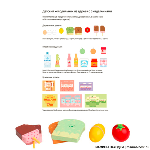 В комплект входят 25 различных имитаций продуктов питания из дерева, пластика и картона, поэтому вам и вашему малышу будет интересно играть. Деревянные продукты можно разрезать: 3 яйца и 2 кусочка хлеба крепятся магнитами, лимон и помидор - на "липучке". Баночки и бутылочки с соусами, джемом, йогуртом и пр. выполнены из пластика. Пакет молока, тушеное мясо, желе и пр. - картонные коробочки.