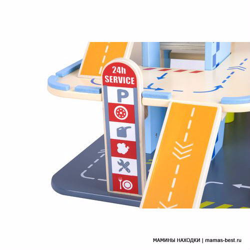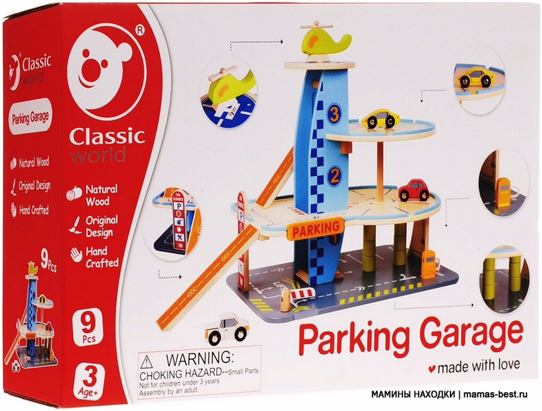 Компактная и эргономичная парковка из дерева вместит все любимые машинки. В наборе 3-х уровневая парковка, вертолетная площадка, 2 скоростных спуска, заправка, информационное табло, 3 машинки и вертолет.