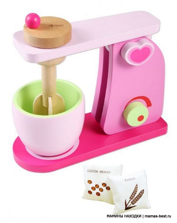 Деревянный миксер имитирует работу настоящего прибора: мешалка вращается, работает переключатель, чаша съемная. В наборе 2 мешочка - какао и мука. Маленький кулинар сможет испечь для кукол любимые сладости!