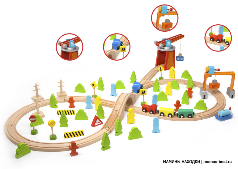 Поезда и вагоны на магнитных сцеплениях позволят менять состав самостоятельно. Отличительная особенность набора - наличие двух железнодорожных составов, грузового и пассажирского. Представьте, с каким удовольствием малыш будет увлеченно расставлять указатели, рельсы, домики и прочие фигурки конструктора.