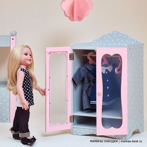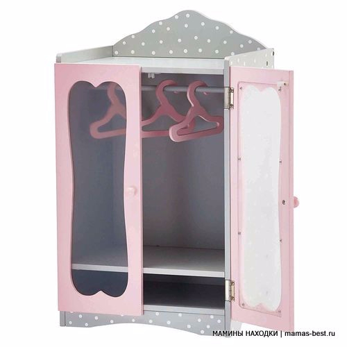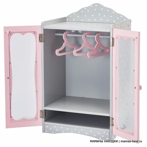 Двери шкафчика с прозрачными стеклами плавно открываются, установлены специальные стопперы, чтобы уберечь детские пальчики. В комплекте 3 розовые вешалки из дерева, на которых можно разместить кукольную одежду. Стильный дизайн в серо-розовых тонах впишется в любой интерьер.