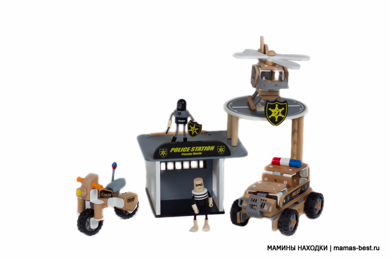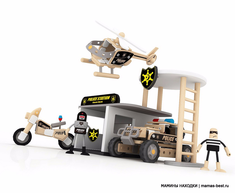 Оригинальный деревянный конструктор с деталями-плашками и подвижными креплениями. С помощью элементов конструктора можно построить вертолет, мотоцикл, внедорожник, настоящую тюрьму и спасательную станцию. Два забавных героя: полицейский и преступник. Уфигурок подвижны руки и ноги. Полицейская станция станет отличной игрой, развивающей фантазию, воображение и навыки конструирования у детей.