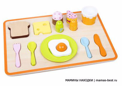 Занимательный набор подарит ребёнку увлекательную и неповторимую игру, ведь это и самый настоящий сортер - все приборы необходимо разложить чётко по силуэтам, и захватывающий "Весёлый завтрак" с помощью которого малыш сможет изучить основы этикета - правила сервировки стола и познакомиться с новыми предметами.