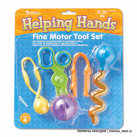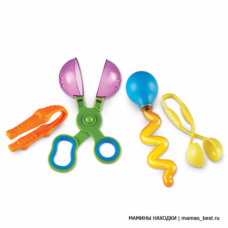 Чудесный набор «на все случаи жизни»! С этим набором из четырех предметов ребенок будет крутить, зачерпывать, сжимать предметы , тем самым развивая мышцы кисти. С помощью набора малыш сможет лучше овладеть навыками мелкой моторики, которые необходимы для того, чтобы научиться пользоваться ножницами и писать.