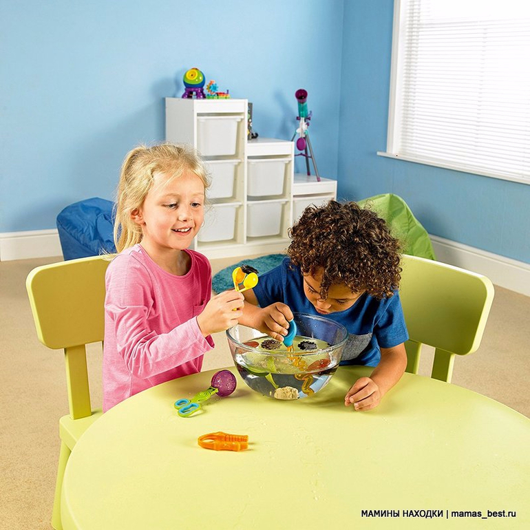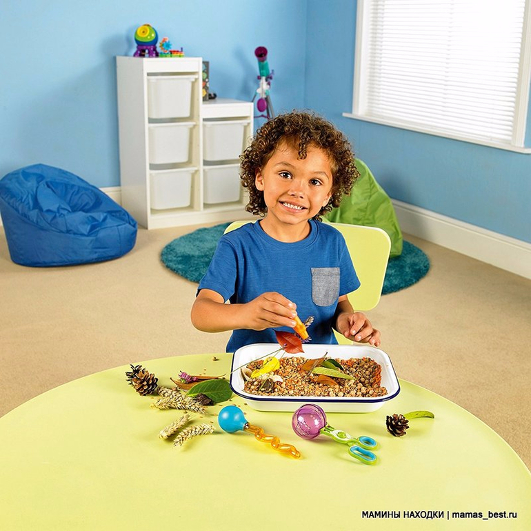 - Отлично подойдет для детей, у которых аллергия на определенные материалы: с помощью щипчиков, пинцетов и пипетки можно брать и двигать любые предметы.