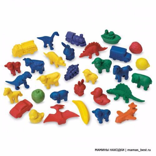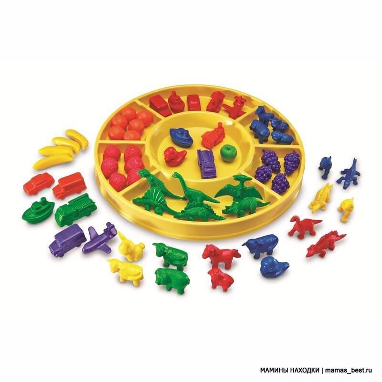 Этот набор отлично подходит для знакомства с основами сортировки. Дети обожают эти прочные, мягкие резиновые фигурки. Животные, транспорт, фрукты, динозавры - каждый ребенок найдет себе фигурки по душе. Они приятны на ощупь, прекрасно лежат в детской руке, не выскальзывают и стимулируют подушечки пальцев. Распределяя фигурки по разным характеристикам (цвет, количество, размер и проч.), ребенок развивает такие математические умения, как простой счет, сложение и вычитание, следование алгоритму.