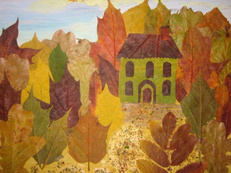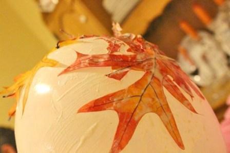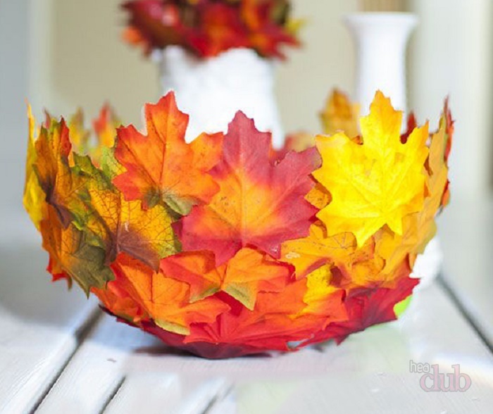 Как уже было сказано выше, листья принимают форму воздушного шара, если наклеить их на него. Таким образом можно сделать узкие вазы или плоские тарелки, как пожелаете. Тарелка делается аналогично вазе. Сначала надуваете шар, затем намазываете его клеем, приклеиваете листья и вуаля - тарелка готова.