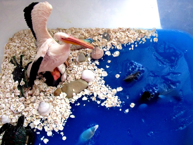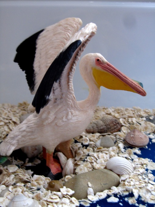 долго думала как пелика сфотографировать в своей среде. А тут проводила для ребенка ТН Морские обитатели и сделала вот такой импровезированный океан и ребенка удивила (с удовольствием в нем возился) и пеликана сфотографировала. А океан это крашеный желатиновый раствор. Фигурка фермера это тоже SCHLEICH,
