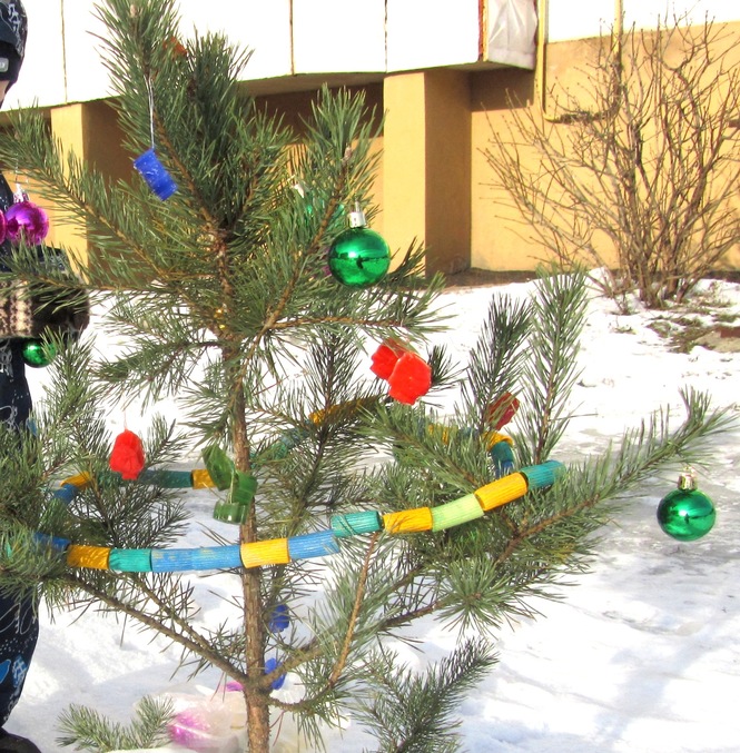 Эту идею я увидела у кого-то из девочек тут на ББ, ждала момента воплотить. Ага про лед я тоже видела- оооочень интересно. Можно не только в ванну, но и расспылителем брызгать на него теплой водой.Лед тоже можно цветным делать. Моему точно понравиться.Мы в этом году делали цветные ледяные фигурки- игрушки на елки во дворе к Новому Году. и макаронные бусы.Еще помимо этих самодельных украшений повесили обычные елочные шарики. Так детвора растащила все льдинки, а простые шары так и остались висеть.