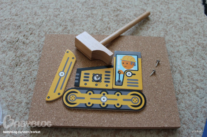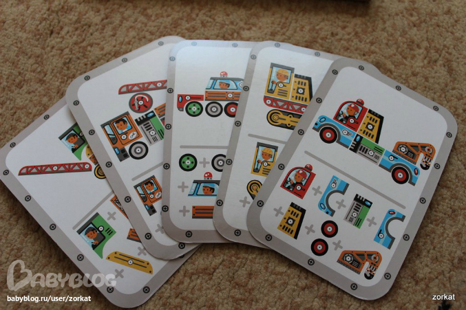 Машинки просто прелесть, ребенок сам сидит, рассматривает картинки, подбирает нужные детали и забивает! Супер!