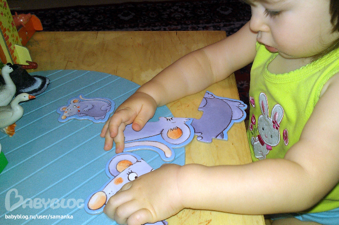 с этим большим пазлом доча расправилась в два счета))) я по нему рассказываю ей истории про кошек. его она разбирает и снова собирает