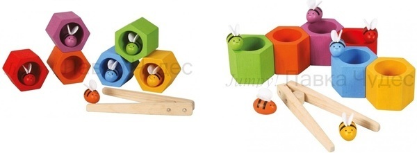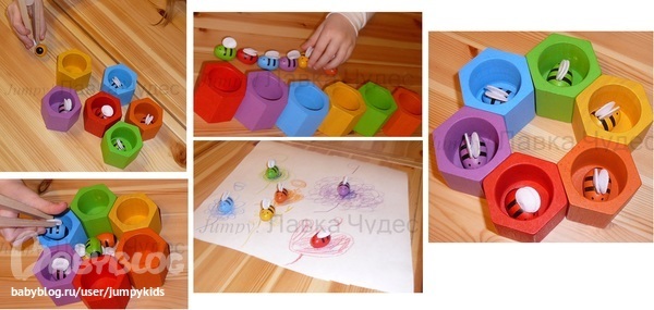 Чудесная развивающая игра! Пчёлок нужно разложить по домикам-сотам соответствующего цвета. Сделать это нужно пинцетом (для начинающих) или с помощью щипцов (пинцет переворачивается другой стороной, это уже посложней). Самые маленькие играют без пинцета, раскладывая просто пальчиками, что тоже не так просто :)