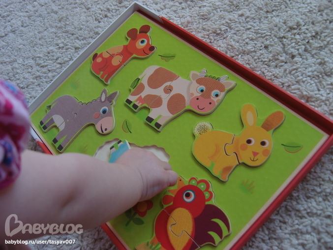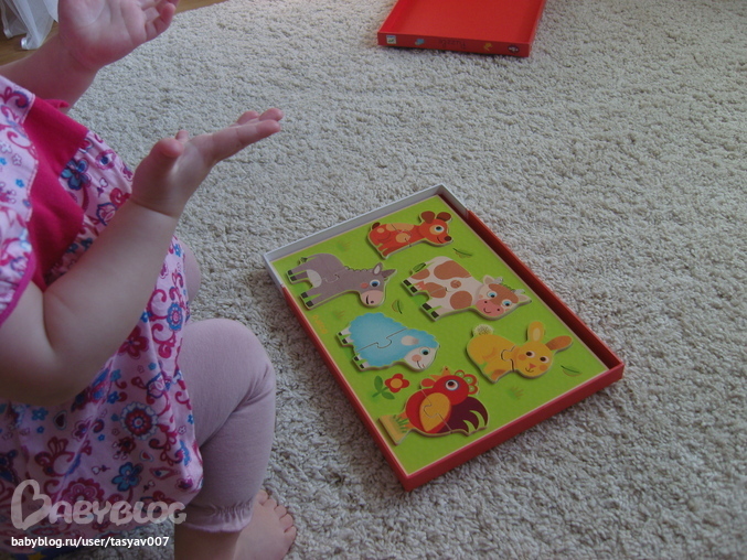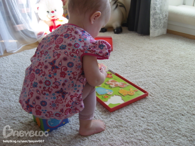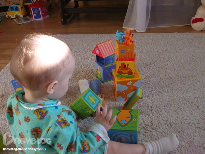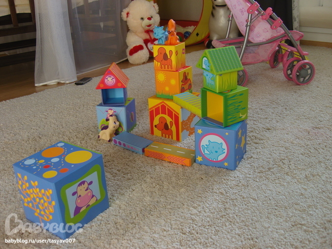 Просто незаменимая игрушка для малышей Кубанимо!!! Качество на высоте, кубики не хочется выпускать из рук. Доча не пропускает ни один цветочек или звездочку, всюду показывает пальчиком и улыбается))) Киса с собачкай сразу стали друзьями (даже сажает их всюду вместе), ходят друг к другу в гости и играют в прятки. Сегодня знакомились с коровкой и учились играть большой компанией)))Так трогательно, когда рано утром видишь сонного ребенка, выбегающего на четвереньках из комнаты с кисой в руках, и с улыбкой во всё лицо лепечущего: "Мяяяя-мяяяу"!