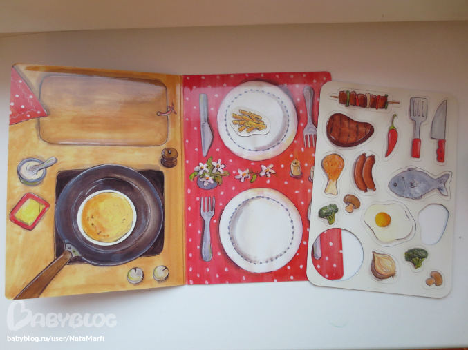 Начну вот с этой новинки. Мне кажется это палочка-выручалочка для мам))) Игра небольшого размера, тоненькая, легкая.... легко поместится в дамскую сумочку. Идеальный вариант взять с собой. Выручит в очереди, в полклинике, в поездке.... Дочке не показывала, но я уверена, что ей понравится: магниты любит и готовить, резать, накрывать на стол...)))