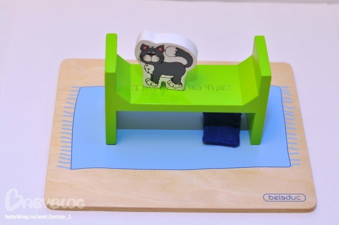 - Малыш, а теперь попробуем усложнить задачу. Поставь, пожалуйста, котика сверху на кровать, а подушку вниз под кровать.