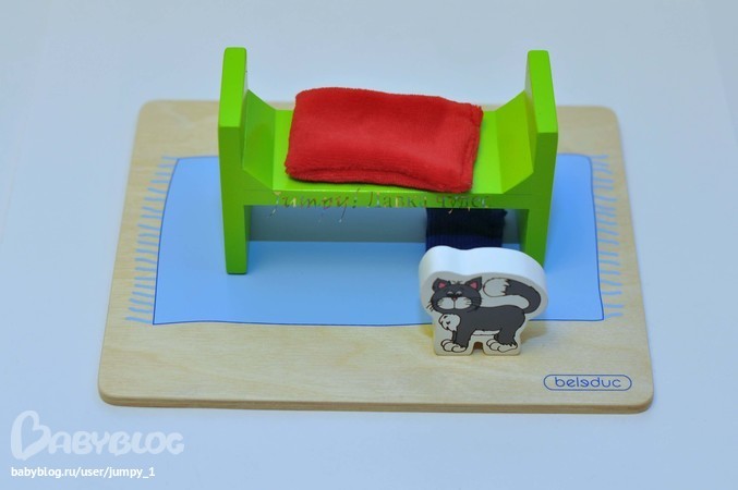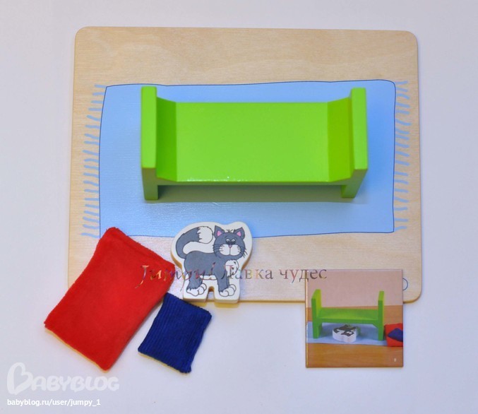 игровой коврик, кровать, подушку, одеяло и кота раскладываем перед собой