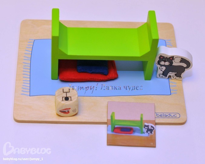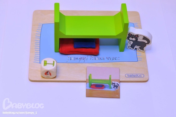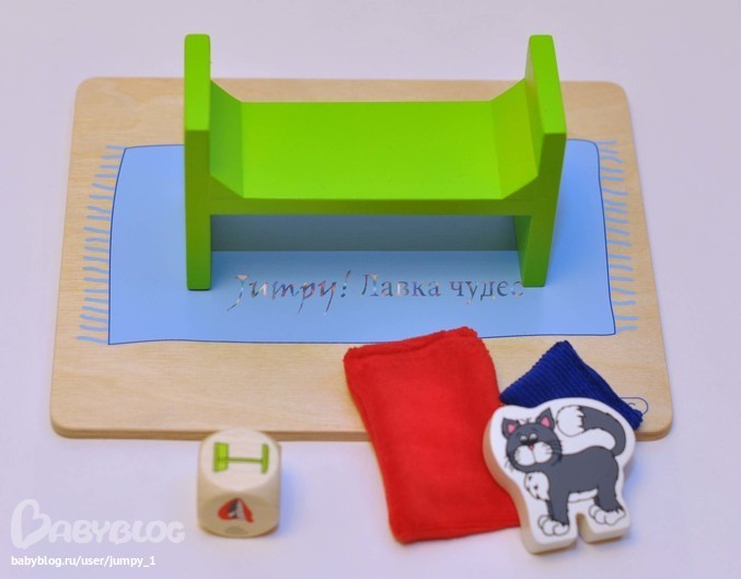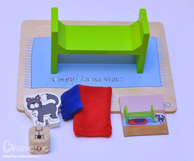 В комплект игры входит: деревянная основа - коврик, деревянная кровать, деревянная фигурка кота, маленькая подушка и одеяло, 34 карточки с заданиями, кубик.