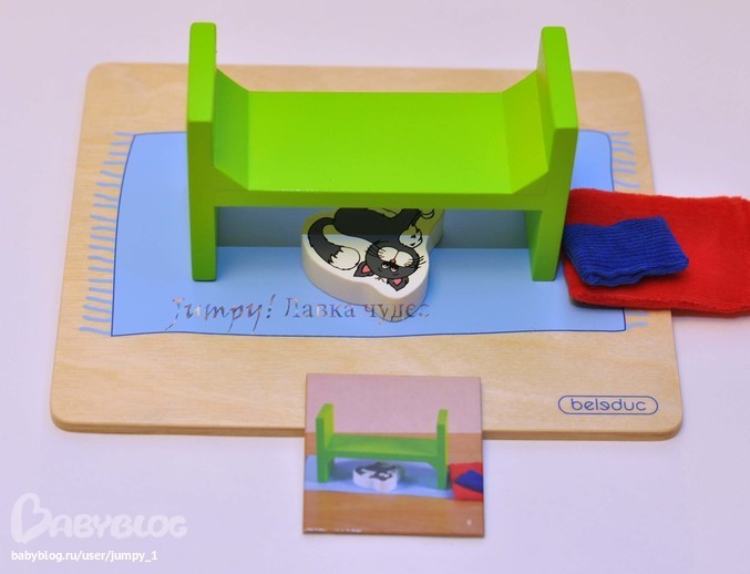 - Молодец, правильно, котик стоит СВЕРХУ НА кровати. А теперь спрячь котика ВНИЗ ПОД кровать.