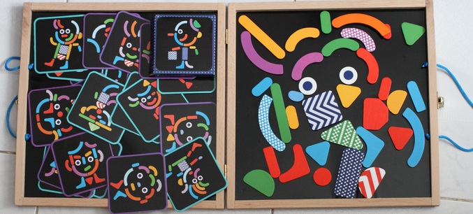 Немцы вложили в набор 16 магнитных форм и 12 магнитных фигур, из этого разнообразия придумали восемь картинок. Наши малыши, уверена, пойдут дальше! Отдельно хочу отметить, что игру удобно брать с собой. Размер коробочки - ок. 32 см на 18 см, при толщине всего лишь 1, 2 см! Так что это даже не чемоданчик, а новомодный планшетик какой-то получается.