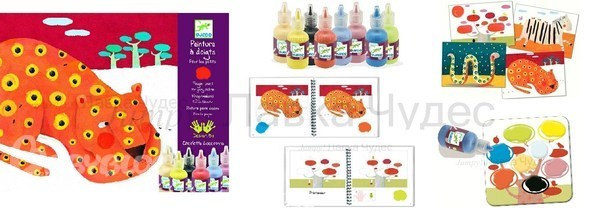 Комплект: 8 картинок больших для рисования (420 x 270 мм), 8 бутылочек с безопаснрой и легкосмываемой краской (30 мл), палитра, цветная пошаговая инструкция.