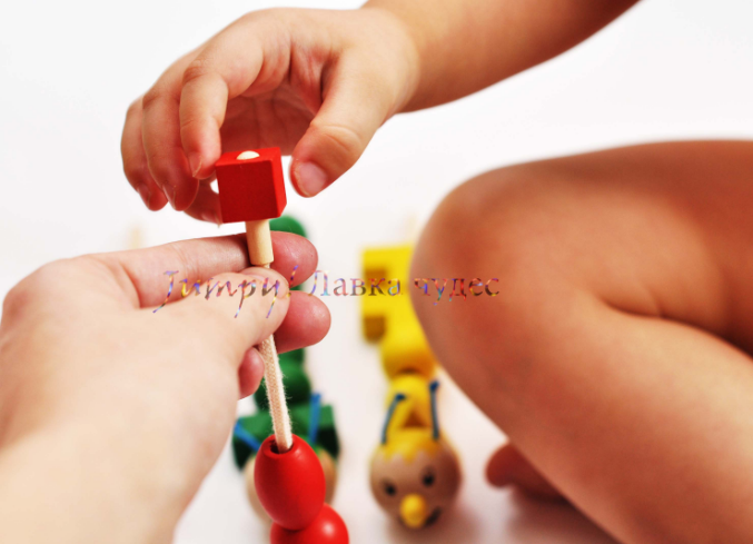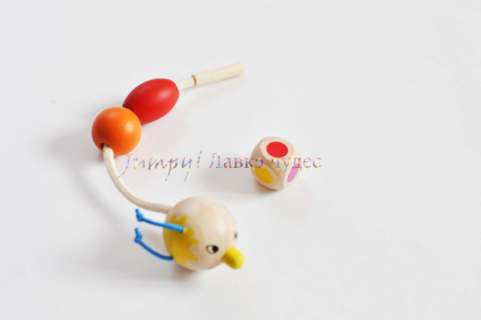 Возраст: настоятельно рекомендует с 3 лет, так как производитель считает, что бусины слишком малы и есть опасность проглотить. Мое же мнение, что как шнуровку можно и с 1,5 лет под пристальным присмотром мамы, а с 2-ух лет по-тихоньку начинать вводить правила и кубик. Размер бусин в детской руке специально сфотографировала: