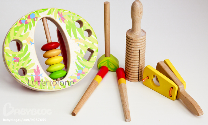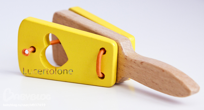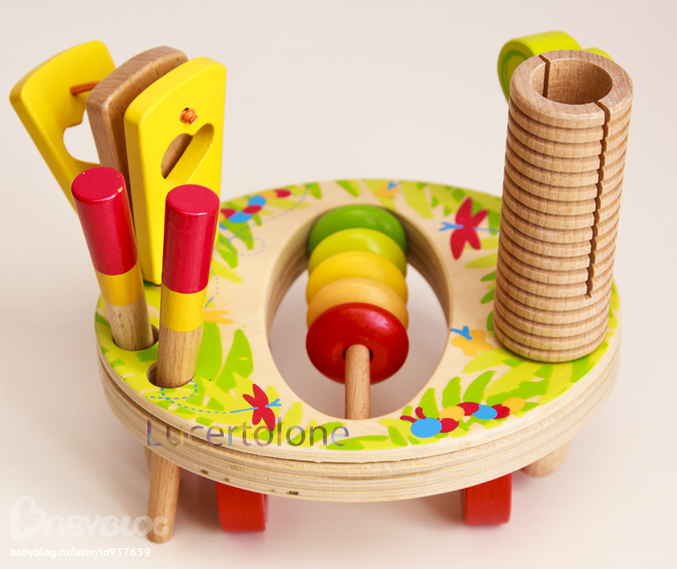 Итак, в подставке «трещотка» (радующая, а не пугающая малыша. А то подарили нам как-то…довели до слез моего Чиполинку), палочки, чтобы бить в барабан (да-да! Подставка по совместительству еще и барабан!), счеты (передвигая их тоже, оказывается, можно добиться оригинального звучания) и неведомый нам доселе инструмент. Звук необычный, извлечь его можно, проведя палочкой с сердечком по рифленой поверхности.