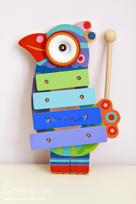 Я как всегда бегу впереди паровоза, мой глаз уже коситься на огромный ксилофон Aba Factory (картинка здесь http://www.babyblog.ru/community/post/Jumpy/84081) Но пока глаз косится, умом понимаю, что это опять будет покупка больше для меня =) Так что будем радоваться пока попугаю, все-таки ближе к нашему возрасту. Он хоть и музыкален, но суров, запросто выдержит серьезные удары молоточком. А потом, когда освоим принцип и поймем задачу, будем отбивать «Жили у бабуси…» на инструменте посерьезнее.