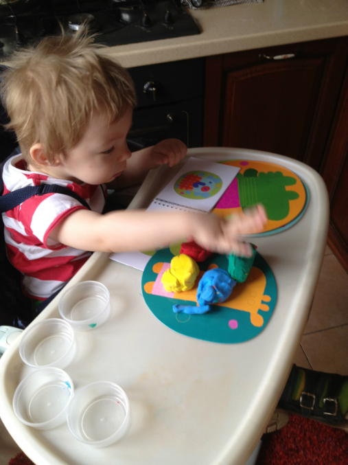 Пару слов про пластилин. С утра, сразу после завтрака, сын просит дать ему пластилин поиграть, но вот наклеивать его ему не очень нравилось. Я перестала настаивать и просто стала подсовывать кружочки с рисунками, когда он играл. Потом сама начала отрывать кусочки пластилина и лепить из на картонку. Сын теперь делает следующее)))