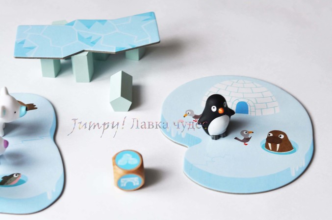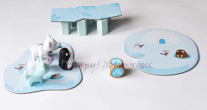 В состав игры входит: 4 животных, 3 игровых поля (1 поле "рыбалка", 1 ледяной мост, 1 поле "хижина"), 6 деревянных опор моста, 1 игральный кубик, инструкция на русском языке.