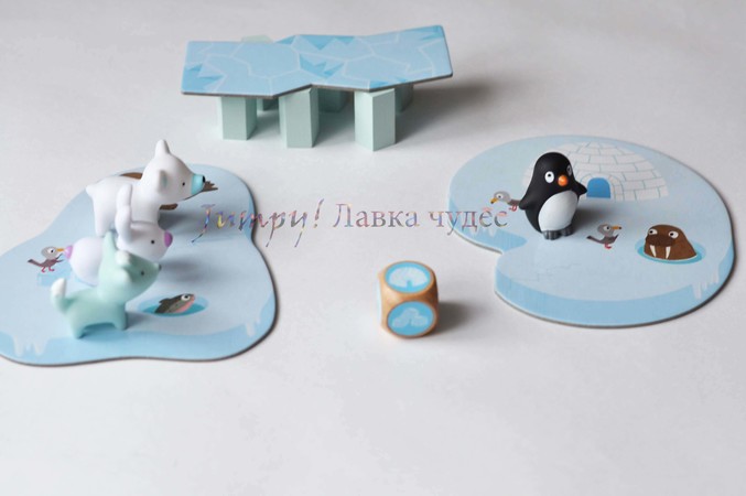 Четыре малыша - медвежонок, собачка, зайчонок и пингвинёнок - хотят добраться до своих домиков-иглу на Льдине. Только малышам приходится быть очень осторожными, так как ледяной мост может рухнуть в любую минуту, от любого неосторожного движения! А добраться до места они могут только вместе, сообща. Эта игра учит детей сотрудничеству, умению договариваться, играть и выигрывать ВМЕСТЕ!