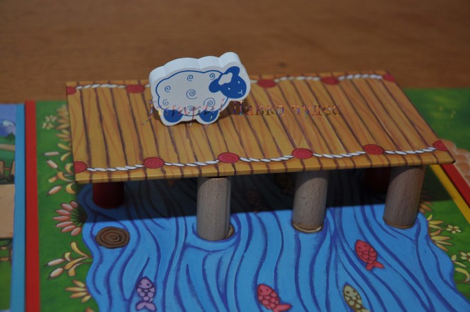 В состав игры входит: 9 овечек, 1 пастушки, 1 собачки, 4 игровых поля (1 поле "гора", 1 поле "деревня", 1 поле "река, на которой мост", 1 поле овчарня"), 10 деревянных опор моста, 1 мост, 1 деревянная палочка, 1 овчарня с деревянной балкой, 1 игральный кубик, инструкция на русском языке.