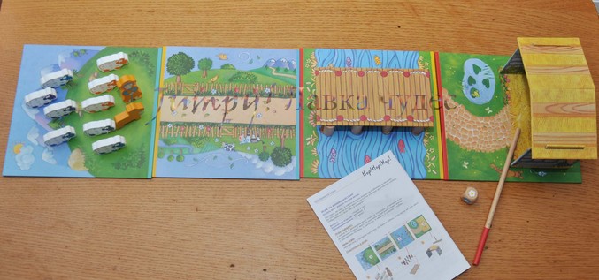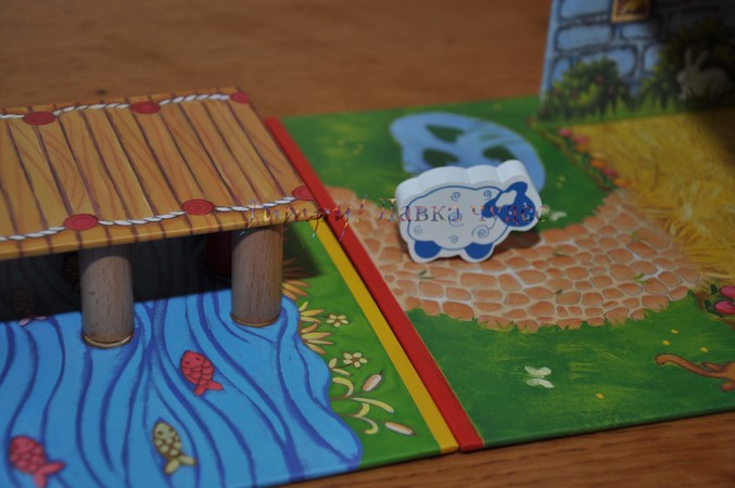 Итак, игровое поле состоит из: игрового поля "гора", игрового поля "деревня", моста и игрового поля "овчарня". Изначально Все овцы, пастушка и собака находятся на игровом поле "гора". Игру начинает самый младший игрок. Он бросает кубик и ...