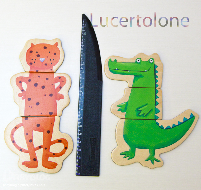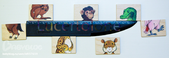 В поисках еще одной версии игры обнаружили интересный набор Beleduc. До сих пор с этой фирмой мы не были знакомы. Серьезное упущение, скажу я вам. (Теперь поглядываю на другие их игры, на многослойный пазл с машинкой, в частности). Исполнение отличное. Деревянные тоненькие дощечки удобны для маленьких ручек.