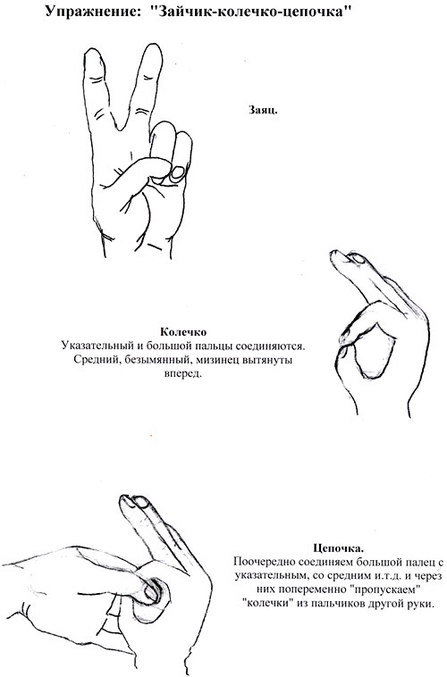 Сначала попробуйте это упражнение медленно и только одной рукой. Итак, большой палец соединяем с указательным, получаем колечко. Потом большой палец со средним, затем с безымянным, а потом с мизинцем. Получилось? А теперь усложните задачу, перебирайте колечки из пальцев одной руки быстрее. Когда полностью освоите это упражнение на одной руке, можно усложнить - быстро перебирать пальцами колечки на обоих руках.