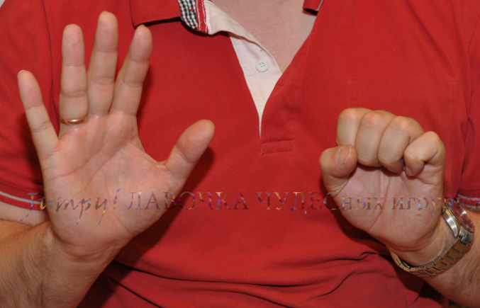 Левая рука держит кончик носа, правая - левое ухо. Одновременно отпускаем руки, хлопаем в ладоши и меняем положение рук: правая рука держит нос, а левая - правое ухо! Получилось? У меня далеко не с первого раза!