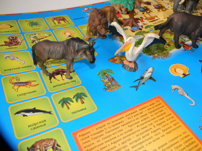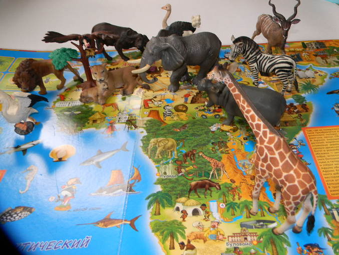 Читальня на лавочкеАтлас огроооомный, листы из плотного картона, так что ребенок может на нем сидеть и раскладывать фигурки животных и с атласом ничего не случится.