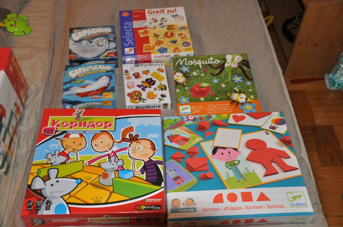 Настольные игры - еще не открывали. Есть у нас игра Москито - она наподобии Барабашки, но немного все атки другая. Тоже надо хватать, бить или сажать пчелу на цветок....также карточки выкладываются и кто быстрее сообразит что нао делать-делает. Увлекательна и задорна. Детальки сделаны из приятной на ощупь резины...яркие и качественные.