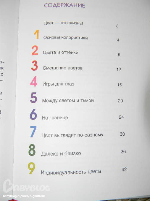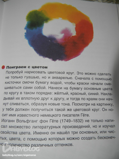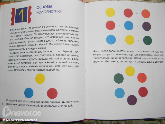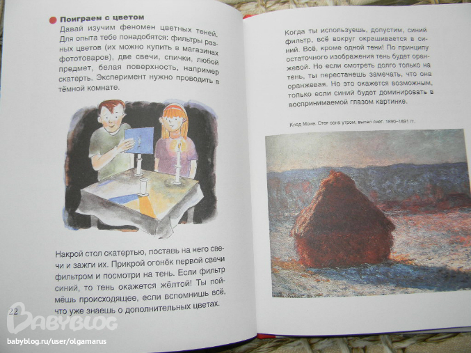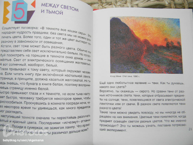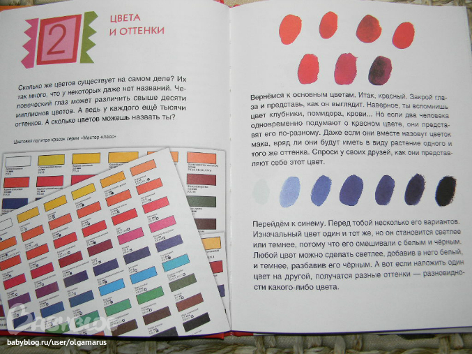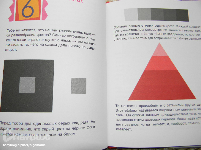 Не смотря на большое количество отрицательных отзывов, я все же приобрела эту книгу и мне она очень понравилась. Книга по колористике , для детей, а сын у меня сейчас просто обожает смешивать краски и получать разные цвета, всё время пытается угадывать, какой цвет получится при смешивании и всегда радуется результату. В этой книге мне понравилось, что все очень доступным языком изложено, множество примеров которые можно повторить дома, таблицы смешивания цветов с основными цветами и с дополнительными, что такое контрастные цвета. Примеры оптического обмана, к примеру, нарисованы два серых квадрата одинакового оттенка, но один квадрат помещен в центр черного и из за этого, он нам кажется светлей. Рассказывала и показывала на примерах сыну, распечатала два маленьких квадрата серого цвета и один большой черный и демонстрировала Саше что, если серый поместить поверх черного, то нам будет казаться что он светлей, в книге ещё можно почерпнуть много других подобных экспериментов которые можно повторить с детьми. Ещё, в книге есть описания индивидуальности каждого цвета, например красный цвет сильный и агрессивный, он притягивает к себе внимание. Красный цвет может выражать и радость и злобу. В красной комнате сердце начинает биться быстрее и человек дышит чаще. Синий цвет наоборот, охлаждает, в синем помещение, мы дышим спокойней, тело начинает отдыхать. Это цвет спокойствия и надежды. Ну и т.д. В книге после каждой темы детям предлагается «поиграть» с цветом и проверить всё о чем говорилось. В общем, интересная книга и на практике всё будет интересно повторить и объяснить ребенку, много можно для занятий почерпнуть примеров. Насчет бумаги, в отзывах читала что бумага в книге тонкая и светится, не верьте, в книге плотный белоснежный офсет, ничего не светится, блок крепкий, прошит.Есть в книге и ложка дегтя, это флаг Швеции, в книге нарисован флаг оранжевый с синим крестом, хотя флаг Швеции синий с желтым крестом, конечно это не сильно страшно, просто неприятно что такая халатность. В остальном всё отлично, очень рада что эту книгу приобрела, книга нужная!