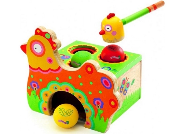 Игрушка-забивалка с сюрпризом: вставьте шарик в любое отверстие в спинке курочки и попросите малыша ударить по нему молоточком, ба-бах, и … наша курочка снесла "яичко". Веселая и простая забивалка понравится как совсем малышам, которые только начинают играть в игрушки, так и более старшим деткам. Ловкость, координация движения, мелкая моторика - все это поможет ребенку достичь результатов в игре. В комплект игры входит курочка, деревянный молоток и три разноцветных деревянных шарика.