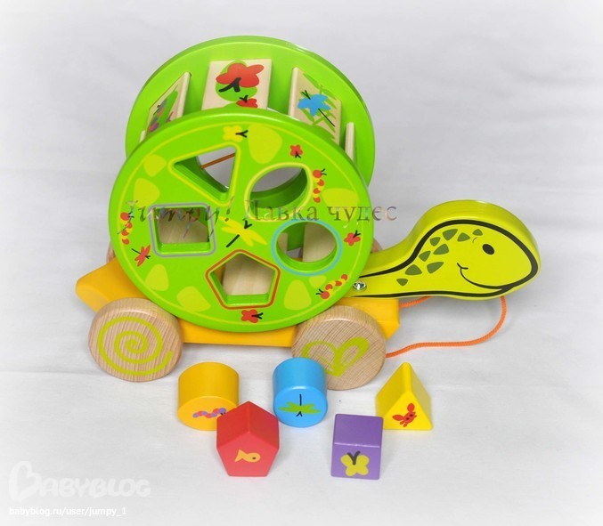 Две игрушки в одном. Сортер - сначала кладем фигурки в черепаху, а потом катим ее за веревочку, в это время фигурки внутри черепахи весело перемешиваются. )))) Но это еще не все ... панцирь черепахи снимается и может быть использован отдельно, как сортер.