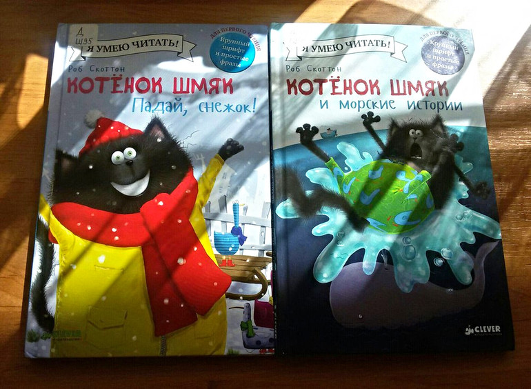В библиотеке дочка теперь первым делом бежит к стенду, где могут стоять книги про котенка Шмяка. Именно могут стоять, потому что разбирают их моментально. И ни в каждый наш приход они есть в наличии. На этот раз нам повезло и досталась книга про зиму. А долгожданный курьер не так давно принес нам книгу про лето.