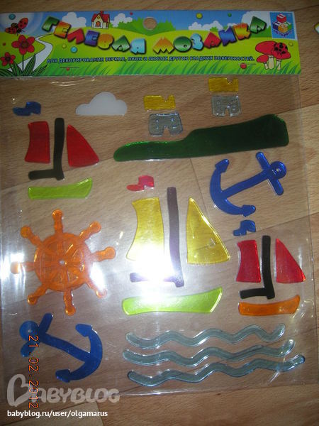 Гелевая мозайка, я видела такие в продаже но не решалась купить, а оказывается это здоровская вещь для развития ребенка, мы с сыном вместе преклеевали её на душевую кабину, Санька правда порвал несколько штучек))), но ему сам процес приклеивания очень понравился, буду теперь ему покупать, спасибо Лизе, за то что подарила нам такую хорошую игру!!!