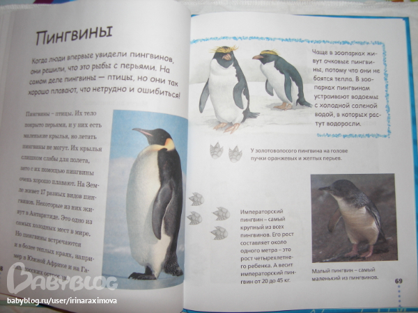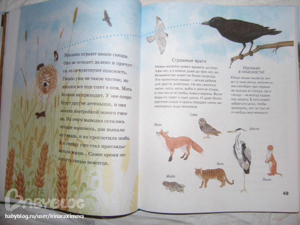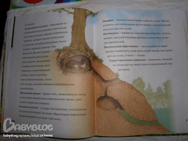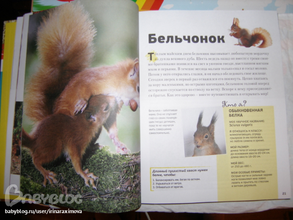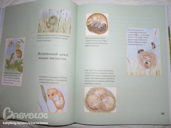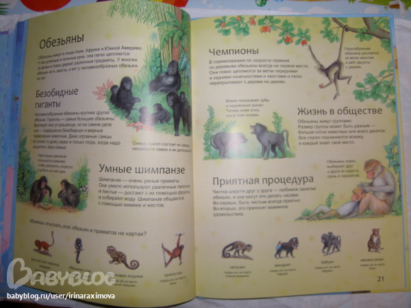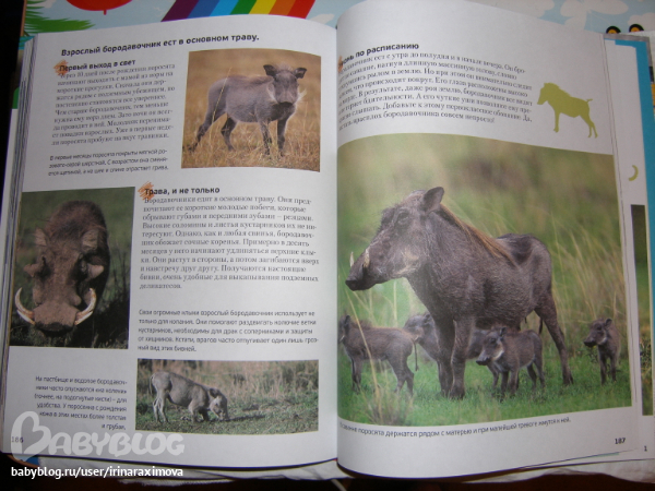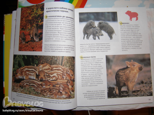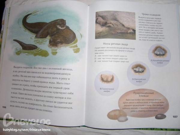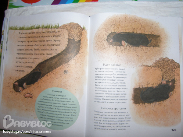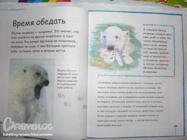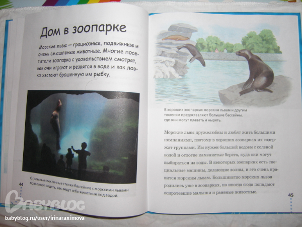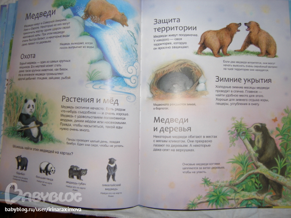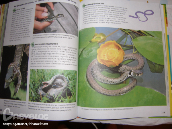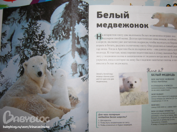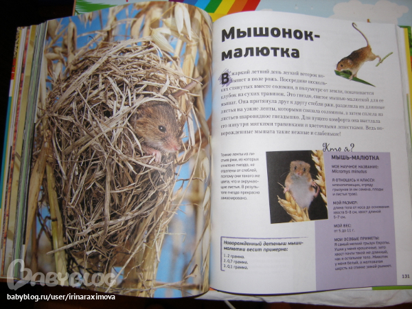 Еще одна замечательная энциклопедия, лично я от нее просто в восторге, качество точно такое же как у книжечки про зоопарк, и только сейчас заметила что подача материала похожая, но опять-таки освещено оч. мало животных. Рассказаано том кто где живет, как строит домики и выводит потомство, чем питается, как размножается, и кто для этих живностей опасен. Очень замечательная!!!!!!!