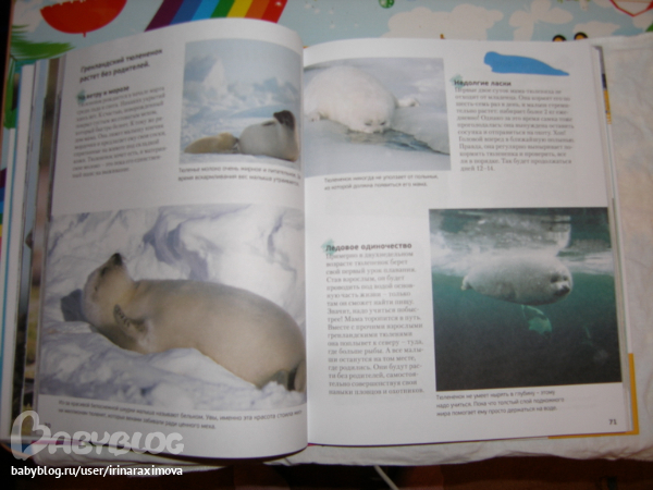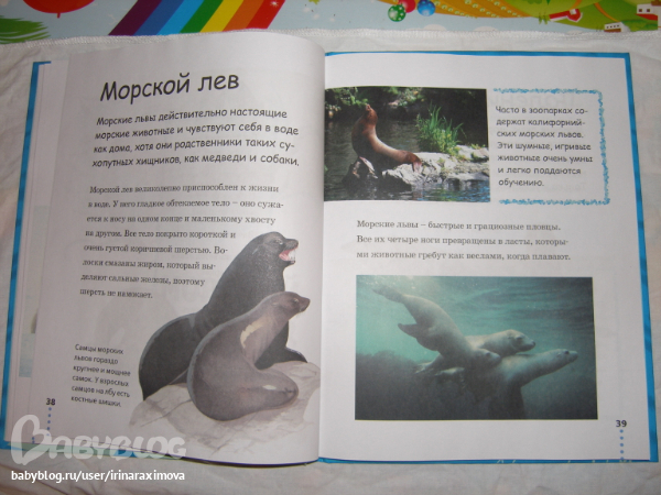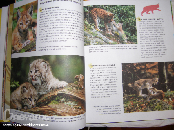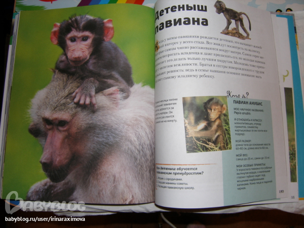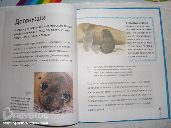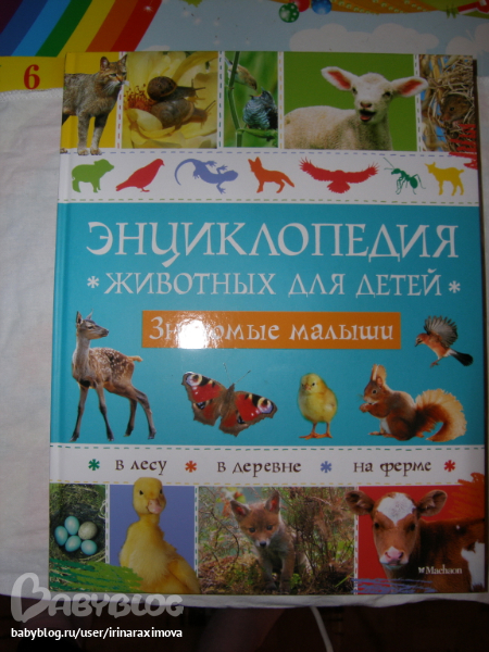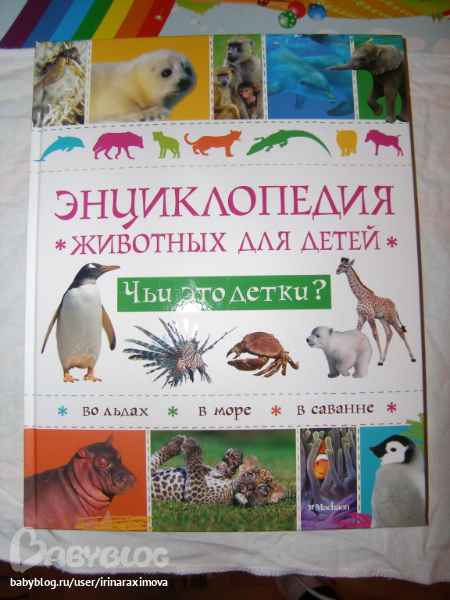 Энциклопедии про дитенышей ивотных от Махаона. Бумага такая же как в зоопарке. На каждого детеныша по 2 разворота. Рассказано о самом животном вкратце и о первых месяцах жизни его детенышей. Фотографи изумительные, была бы мелованная бумага, то было бы просто супер!