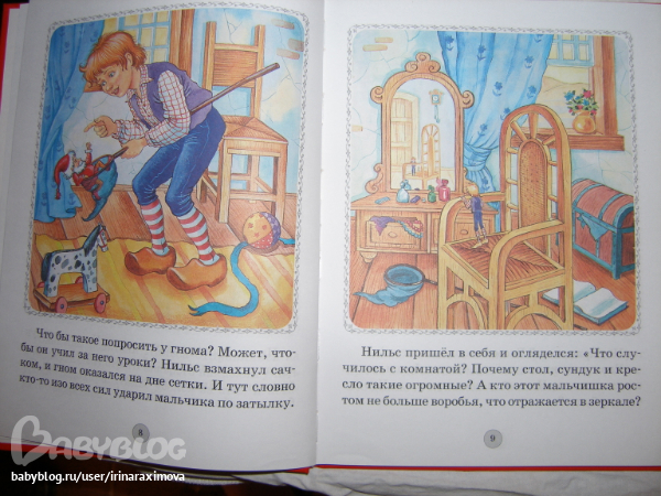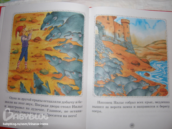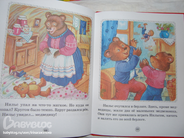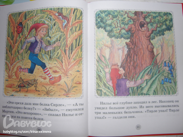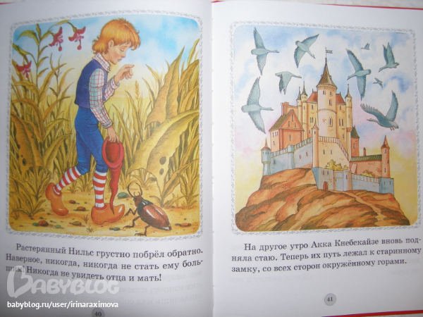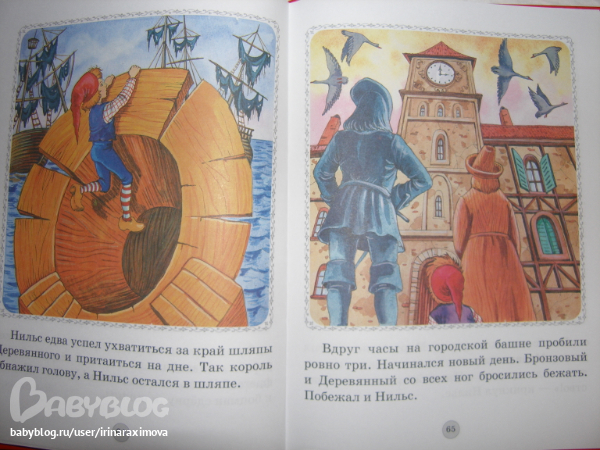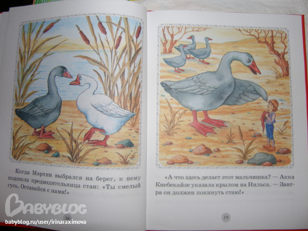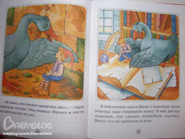 Книжка-картинка Путешествие Нильса с дикими гусями от Дрофа Плюс. Бумага тоноватая, офсет тонковат, но приятный на ощупь, гладкий. Для первого знакомства в самый раз (а если изъявит желание основательно почитать, когда старше будет, то уже другое издание куплю)