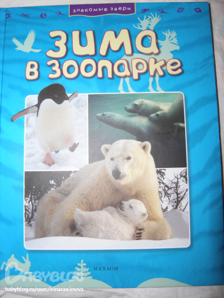 Зима в зоопарке от Махаон. Вторая книжечка из серии знакомые звери. Я уже писала что качество бумаги супер, очень полезная информация, но всего про 3-х животных ... увы ..... была бы энциклопедия с подобного рода информацией про каждого животно, цены бы ей не было.